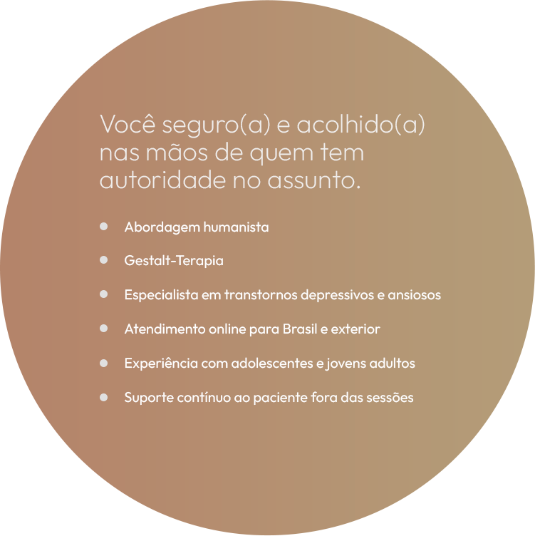 Sou psicóloga clínica e pós-graduanda em transtornos ansiosos e depressivos. Atendo adolescentes e adultos no Brasil e também brasileiros que moram no exterior, através de atendimentos online.